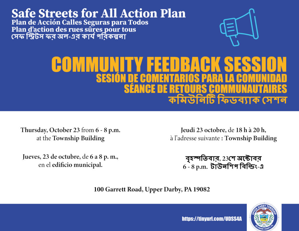 All Upper Darby Township residents and visitors are asked to complete a Community Feedback Survey. This survey can be found at Upper Darby Safe Streets for All (https://upper-darby-safe-streets-for-all-baker.hub.arcgis.com/) and at the One Center. The survey is available in Spanish, French and Bengali.