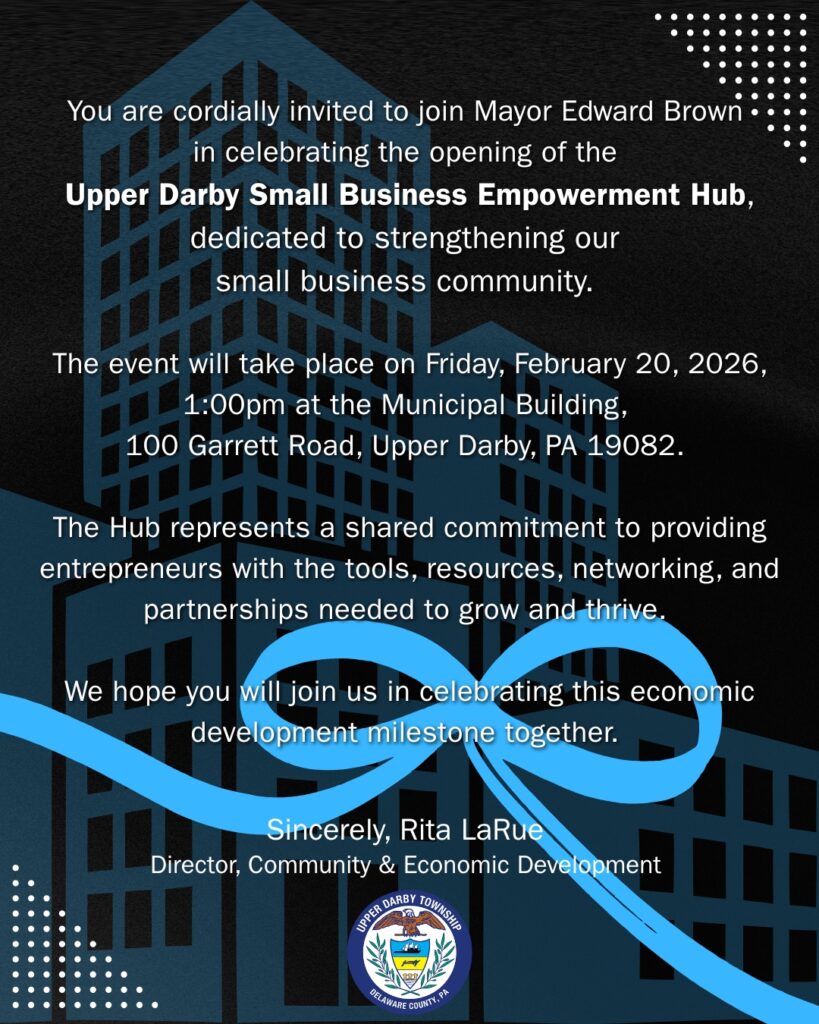 UD Small Business Hub Opening Posted onFebruary 13, 2026February 13, 2026AuthorAdmin The Upper Darby Small Business Empowerment Hub is here! Celebrating the kick-off on Friday, February 20, 2026 at 1:00pm (invitation below.) Share this:Share Share on Facebook (Opens in new window) Facebook Share on X (Opens in new window) X Share on LinkedIn (Opens in new window) LinkedIn Email a link to a friend (Opens in new window) Email